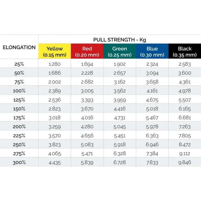 | Alongamento | Força de tracção - kg Amarelo | Força de tracção - kg Vermelho | Força de tracção - kg Verde floresta | Força de tracção - kg Azul Royal | Força de tracção - kg Preto |