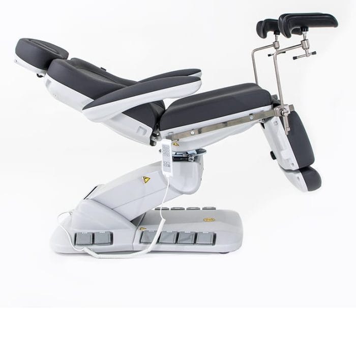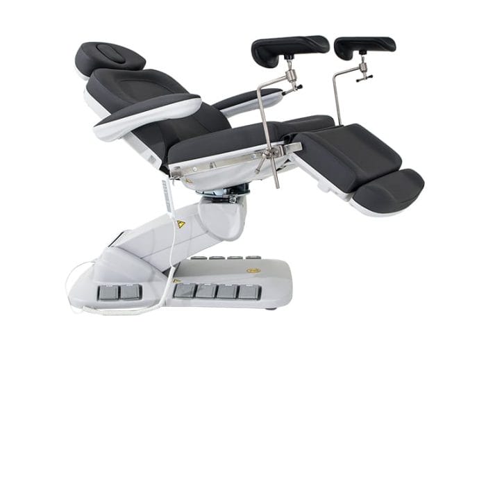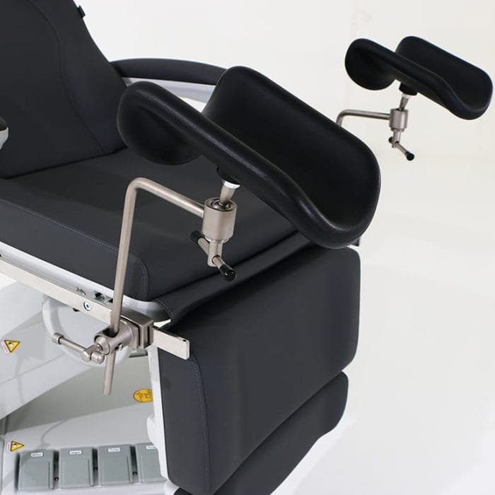 Sillón de reconocimiento ginecológico de alta gama con estructura muy estable, diseñada especialmente para optimizar el espacio de trabajo gracias a la rotación del sillón de 120°.