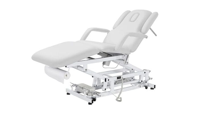Camilla de altas prestaciones especialmente indicada para fisioterapia. Consta de 3 motores que regulan la altura, la inclinación del respaldo y del módulo central. Sistema doble de reposabrazos: los fijos son regulables y los laterales extraíbles. Respaldo con agujero facial y cojín postural adicional. Estructura metálica con ruedas escamoteables que facilitan su desplazamiento. Tapizado blanco en PU de alta calidad y fácil de limpiar. Portarrollos incorporado.